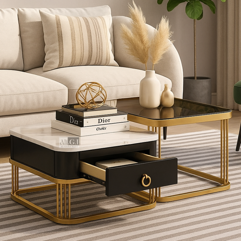 Ali.G.I-White & Gold Nested Coffee Table Set with Drawer (AGI-476)