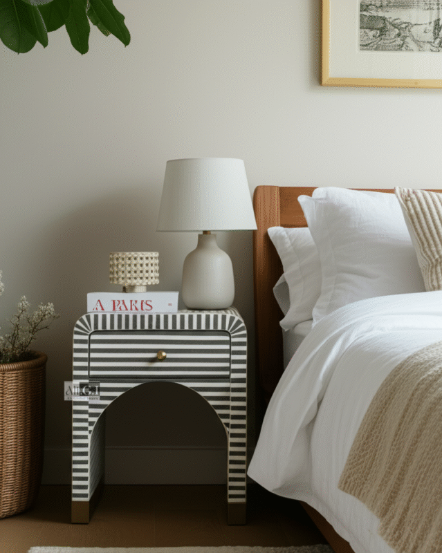 Handcrafted bone inlay top with bold geometric pattern