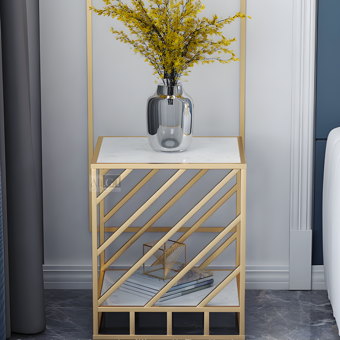 Add a touch of modern elegance to your space with this sleek gold metal side table. Featuring a white marble top and a geometric open frame, it’s perfect for contemporary interiors. The lower shelf provides functional storage or display space, ideal for books, art, or décor. A glossy silver vase with bright yellow faux florals adds a vibrant finish to the setup. Ideal for living rooms, bedrooms, or hallways, this table is both functional and aesthetically refined.