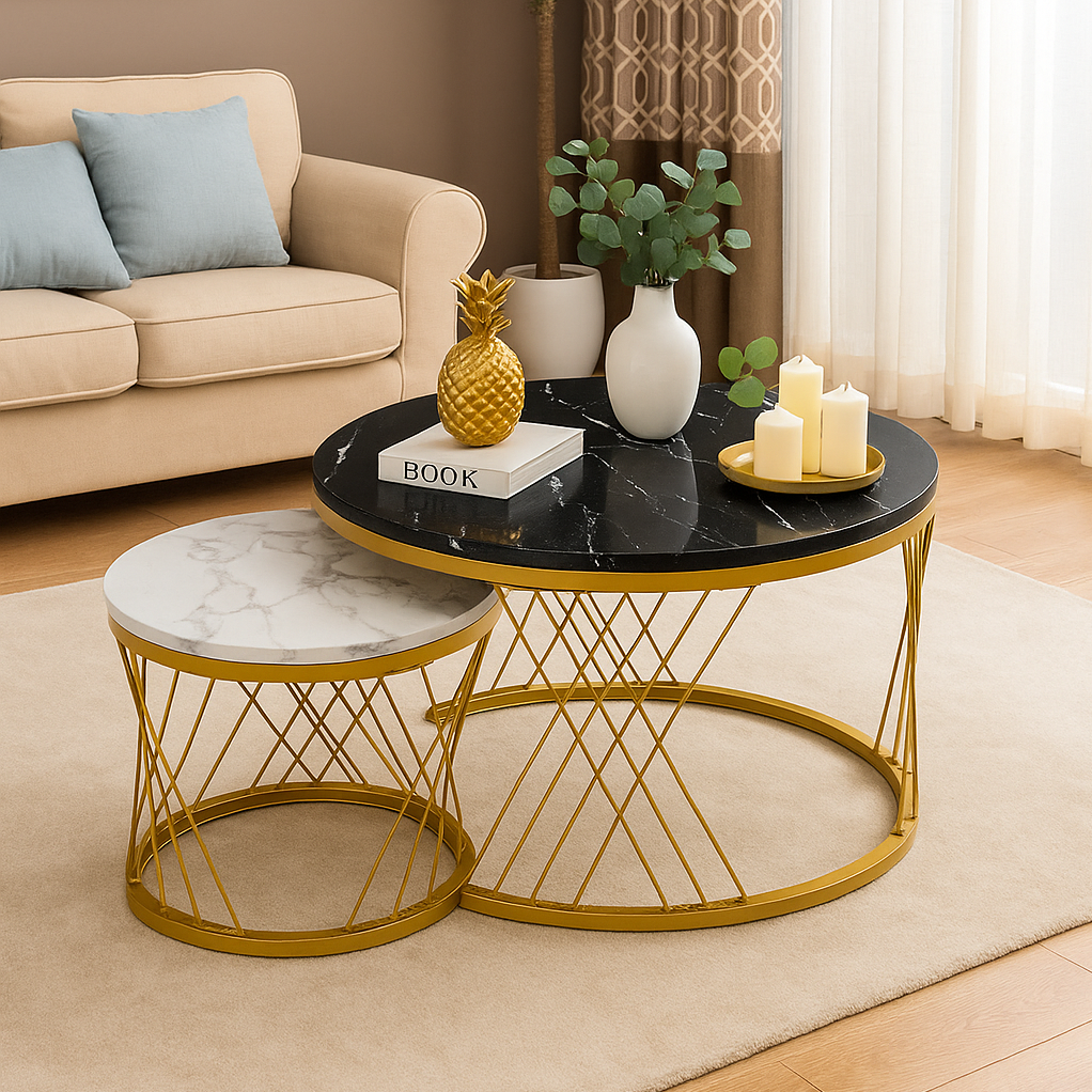 Add flair to your living space with this 2-piece round coffee table set featuring bold marble tops. The larger black marble table pairs beautifully with the smaller white marble piece, both supported by stylish gold-finish metal bases with intersecting lines. Whether used together or separately, this set enhances any corner with style and function. Ideal for living rooms, lounges, or reception areas, these tables provide surface space and striking visual appeal.