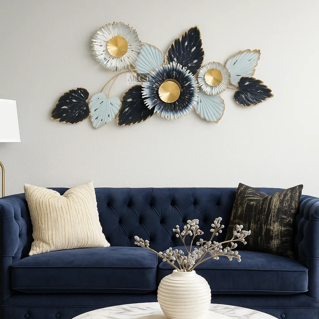 Elevate your walls with this graceful floral metal sculpture, showcasing a blend of navy, powder blue, and shimmering gold tones. The composition features delicately textured petals with intricate edges and brushed gold centers, evoking a sophisticated botanical charm. Perfect for softening modern interiors or enhancing classic décors, this art piece brings a refined elegance and natural rhythm to any space. Ideal above sofas, beds, or hallway consoles.