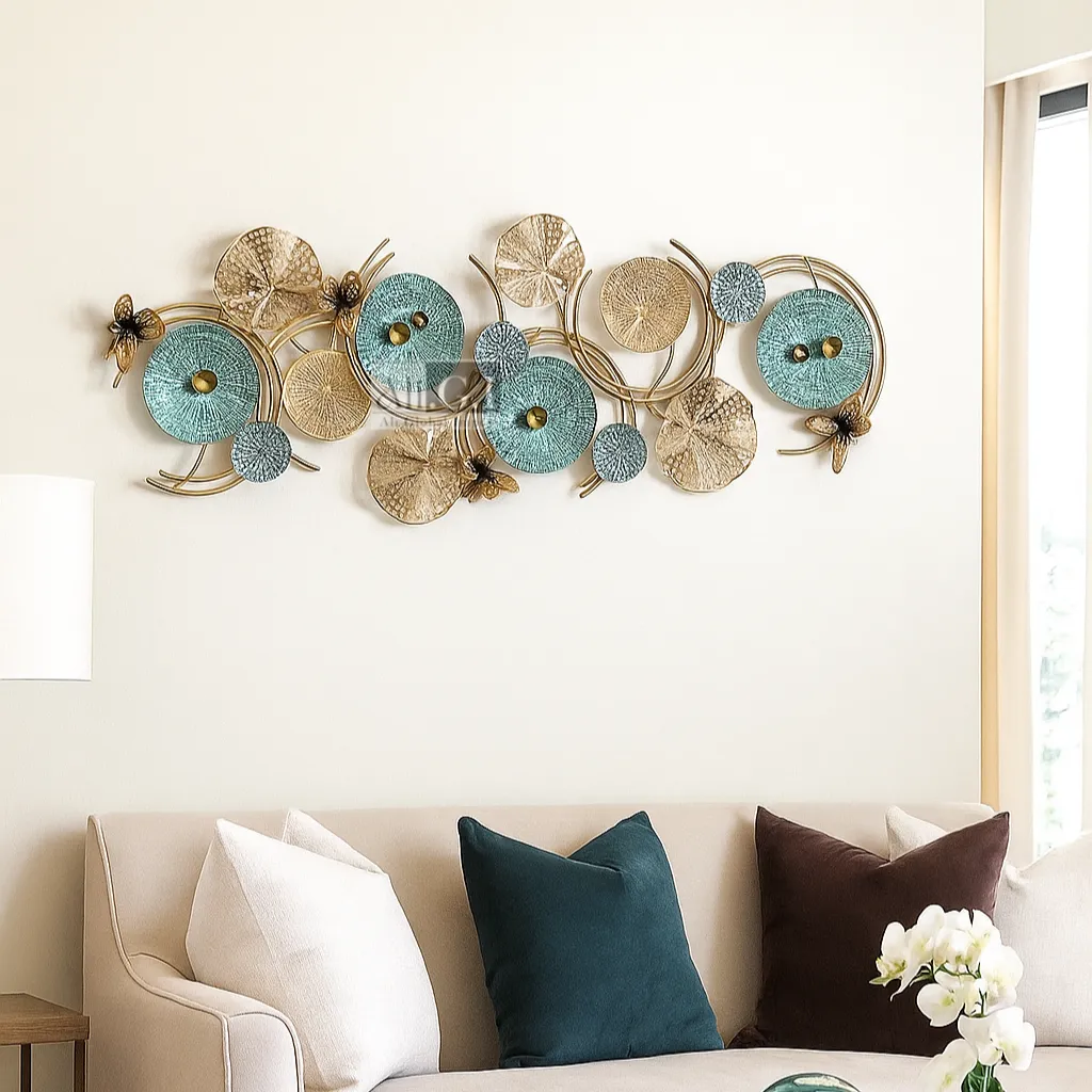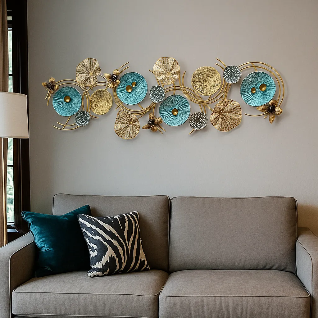 Add a luxurious accent to your living space with this intricate floral-inspired metal wall art. Featuring an elegant blend of teal, gold, and textured metallic tones, this piece brings modern artistry to your walls. The dynamic circular motifs and sculptural elements create a harmonious and eye-catching visual. Ideal for lounge areas, hallways, or living rooms, this decor enhances both contemporary and classic interiors with its graceful charm and craftsmanship.
