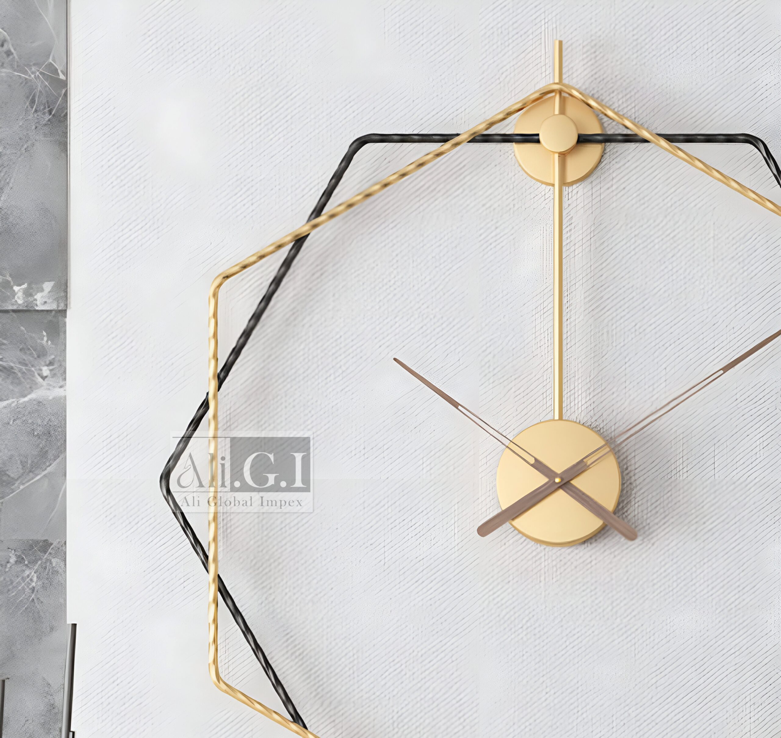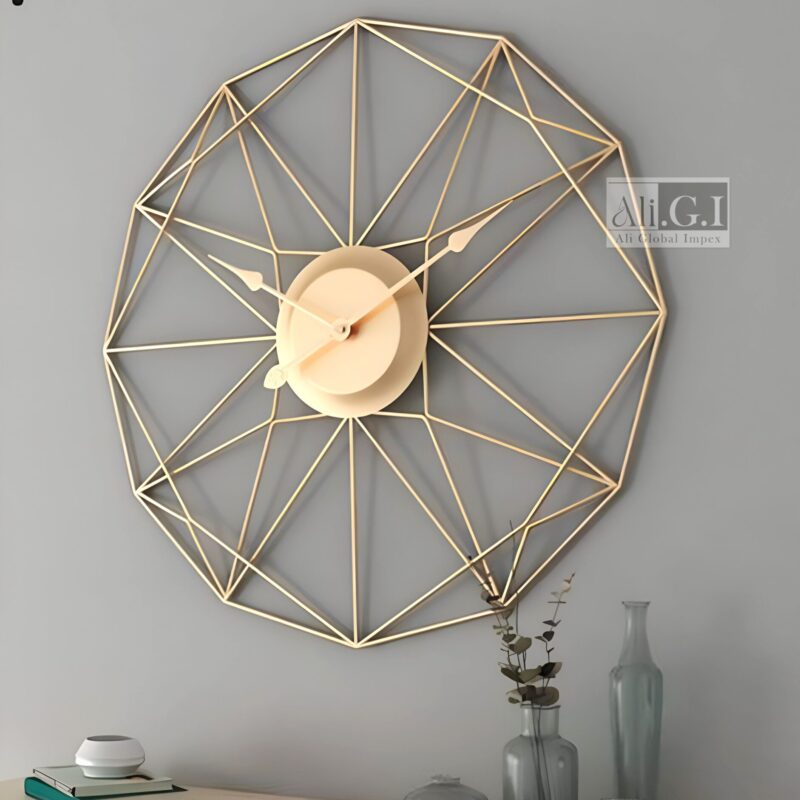 Elevate your interiors with this striking modern geometric wall clock by Ali.G.I. Crafted with a unique octagonal frame combining black and gold metal, it brings a bold and artistic flair to your living space. The minimalist dial features slender hands in gold and black for a contemporary edge, while the twisted metal outer ring adds texture and dimension. Ideal for modern, industrial, or art-inspired homes, this wall clock serves as both a timepiece and a wall statement. Add this piece to your home or office for an instant touch of refined modernity.