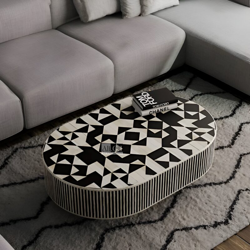 Elevate your living space with this handcrafted 30-inch bone inlay coffee table, featuring an intricate geometric pattern and a bold brass-finished metal base. The detailed craftsmanship and modern silhouette make it a striking centerpiece for any room. Designed with both artistry and durability in mind, this table blends traditional inlay techniques with contemporary luxury. Perfect for modern, eclectic, or bohemian interiors.