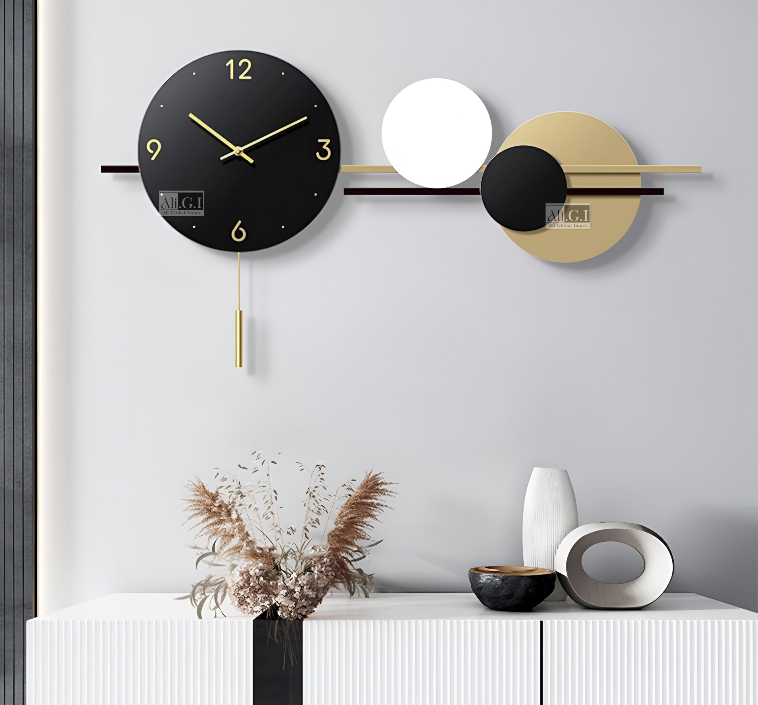 Elevate your home with the Ali.G.I Large Wall Clock with Pendulum, featuring a striking geometric round design. This contemporary timepiece combines style and functionality, making it the perfect focal point for any room in your home or office.