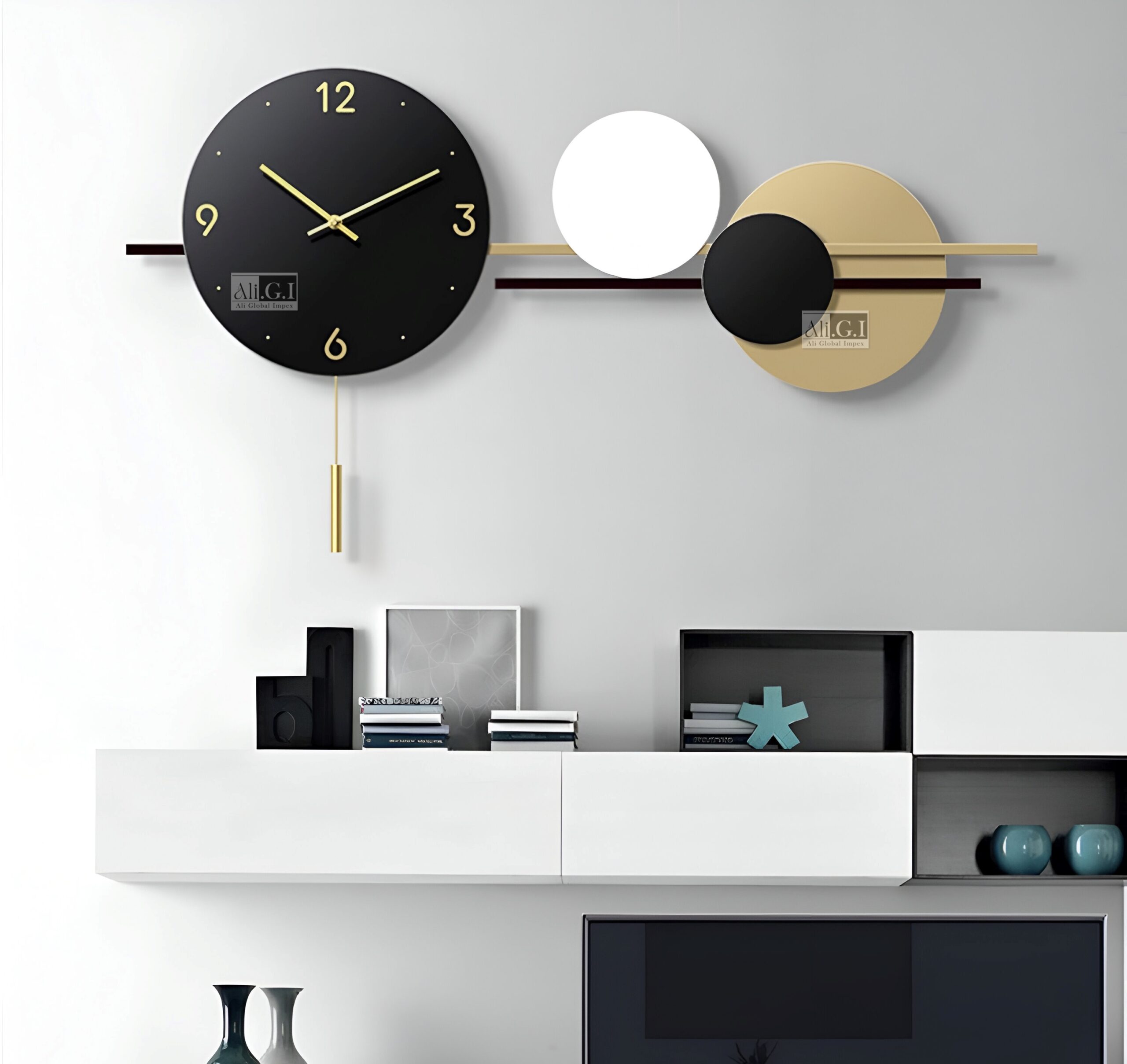 Ali.G.I Large Wall Clock with Pendulum – Modern Geometric Round Clock // adding contemporary elegance to Living Room, Bedroom, Dinig Room, Hall, Office, Hotel & Restaurant (AGI-333, Geometric)