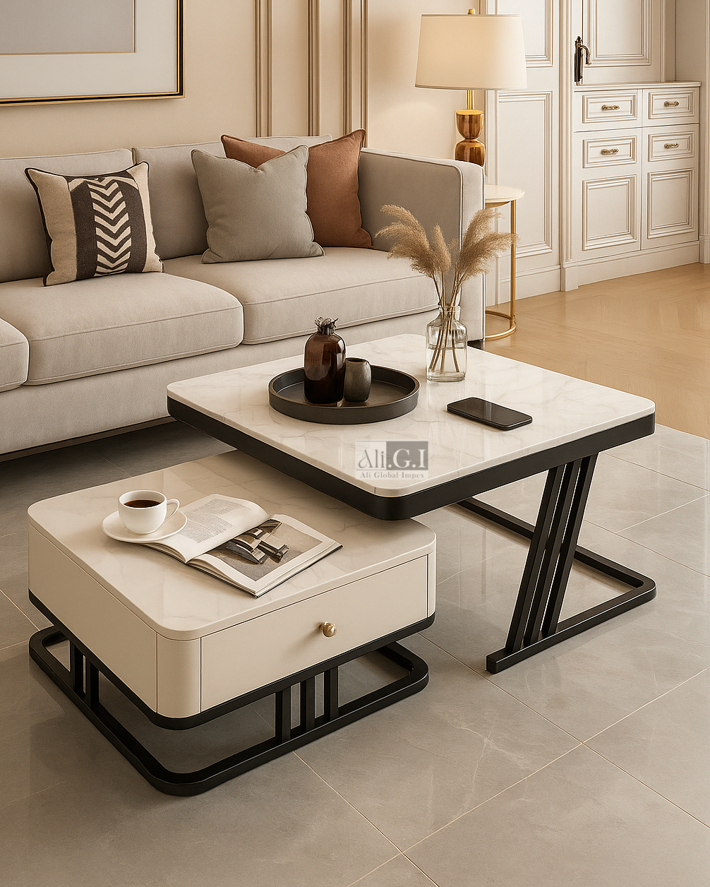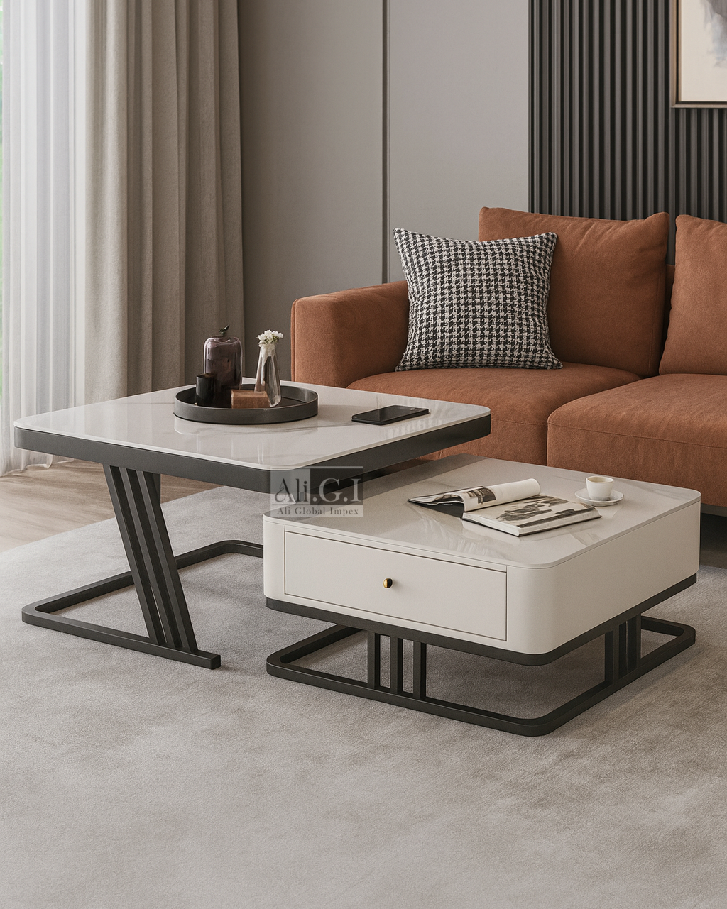 This Ali.G.I modern center table set of 2 combines elegance and functionality with a nested design that saves space while adding style. Both tables feature luxurious white marble tops paired with sleek black metal bases, creating a striking contrast that complements any interior. The larger table offers ample space for display, while the smaller table includes a convenient drawer for hidden storage. The sturdy construction ensures durability, while the compact nesting design offers versatility for use together or separately. Perfect for showcasing décor, serving refreshments, or organizing essentials, this set is a chic and practical addition to your living room.