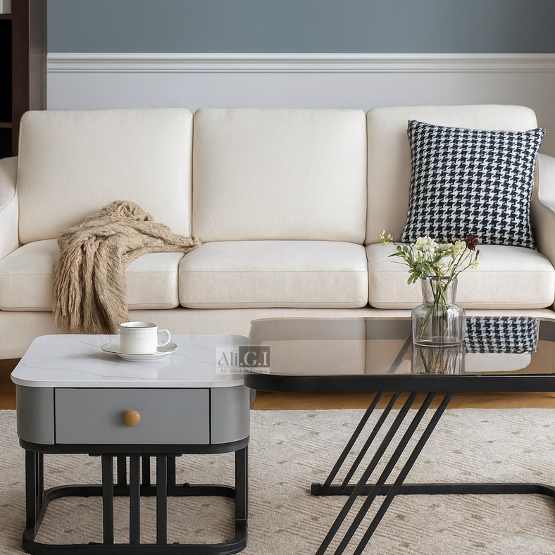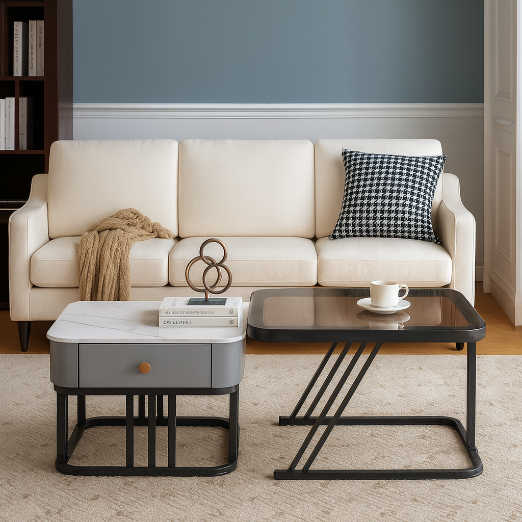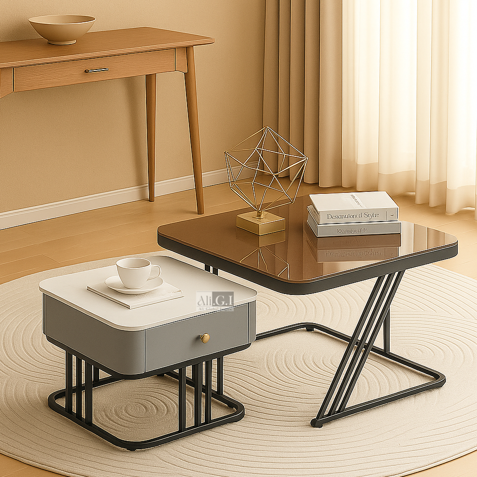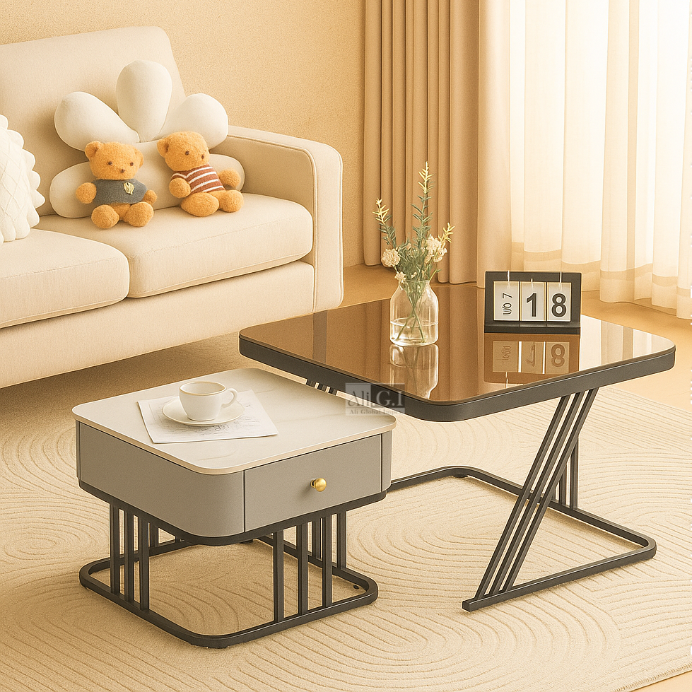 • Hidden Storage: The smaller table is equipped with a discreet built-in drawer to keep your space clutter-free.