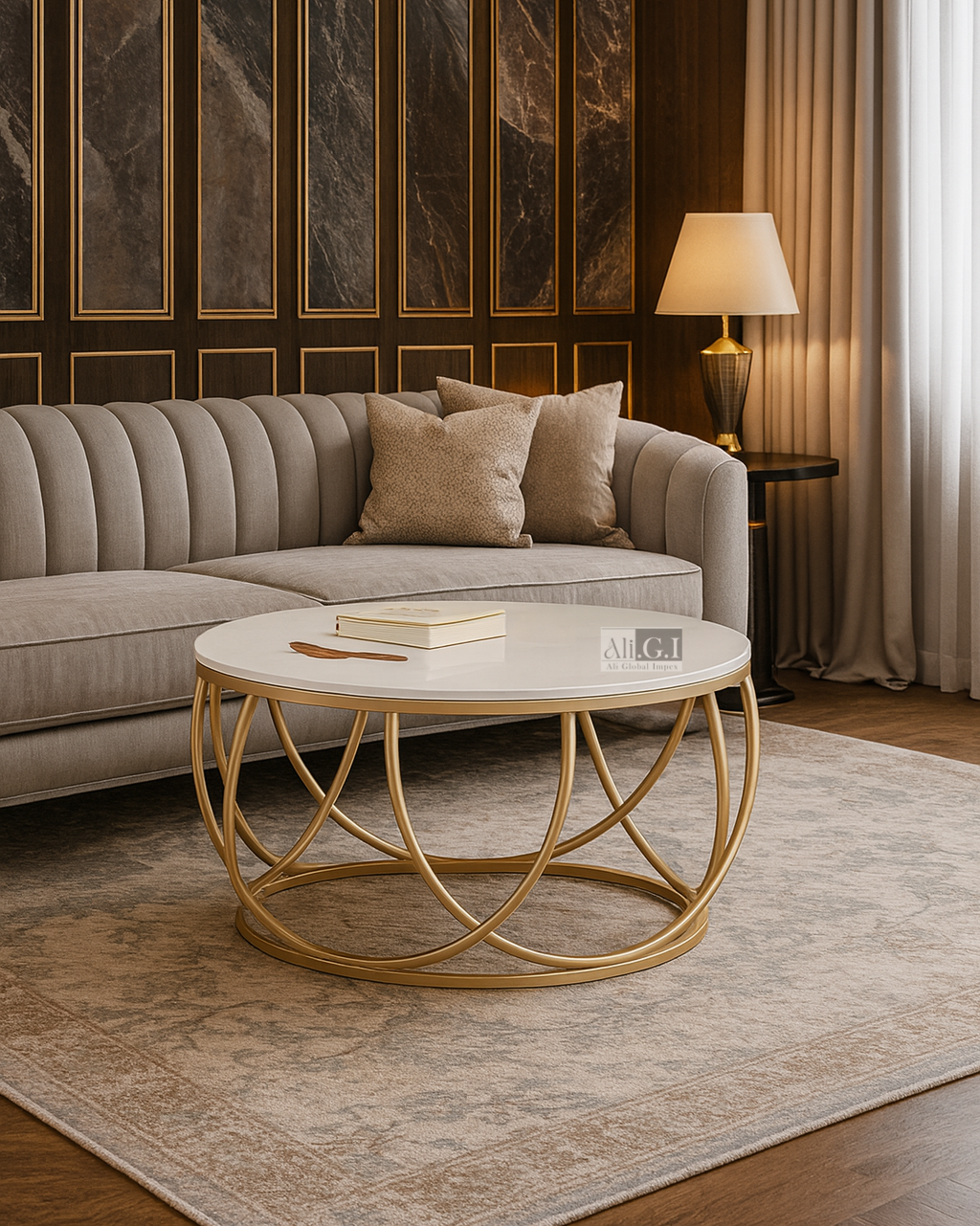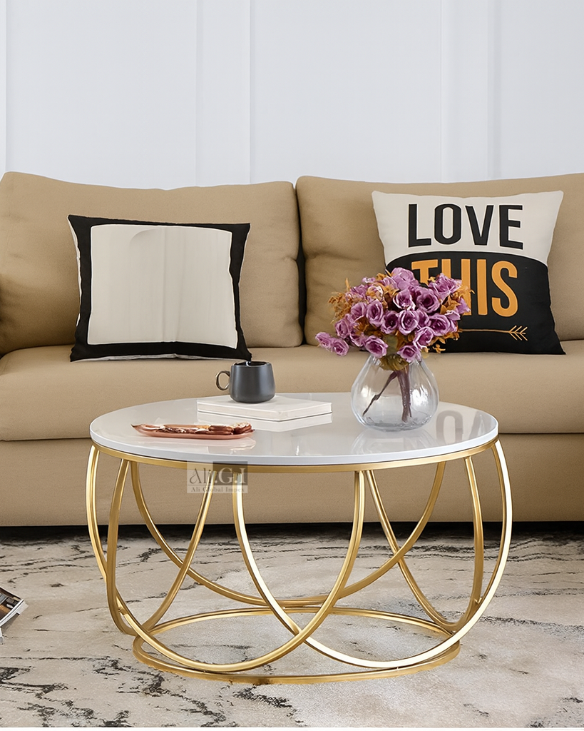 Make a stylish statement with the Ali.G.I White Top Round Table, where modern design meets artistic elegance. The smooth white tabletop provides a sleek and clean surface, while the sculptural gold-finished metal base adds visual interest with its flowing, looped structure. Ideal as a coffee or center table, it effortlessly enhances contemporary, glam, or minimalist interiors. Perfect for serving, decorating, or showcasing everyday essentials, this piece brings both form and function to your living space. Durable, eye-catching, and easy to maintain — it’s designed to impress.